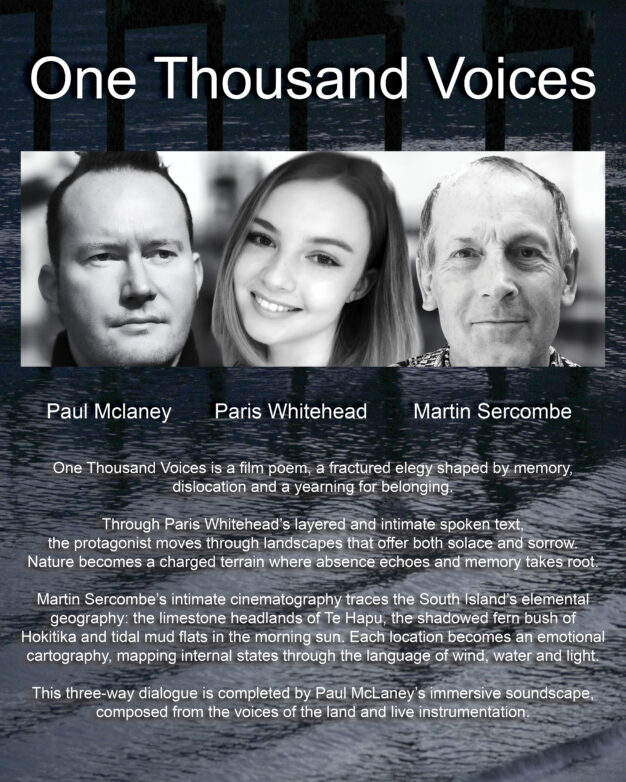 ‘One Thousand Voices is a film poem, a fractured elegy shaped by memory, dislocation, and a yearning for belonging. Through Paris Whitehead’s layered and intimate spoken text, the protagonist moves through landscapes that offer both solace and sorrow. Nature becomes a charged terrain where absence echoes and memory takes root. The spoken text finds its visual counterpart in Martin Sercombe’s cinematography, which traces the South Island’s elemental geography: the limestone headlands of Te Hapu, the shadowed fern bush of Hokitika and tidal mud flats at dawn. Each location becomes an emotional cartography, mapping internal states through the language of wind, water, rock, and light. This three-way dialogue is completed by Paul McLaney’s immersive soundscape, composed from field recordings and live instrumentation. His score flows organically with the imagery and voice, blending breath, birdsong, and echoic tones into a sonic weave that holds the work’s emotional resonance in tension and release. In essence, the film is a meditation on loss, ancestry and the fragile threads that bind memory to landscape. Through Paris Whitehead’s layered and intimate spoken text, the protagonist moves through landscapes that offer both solace and sorrow.’