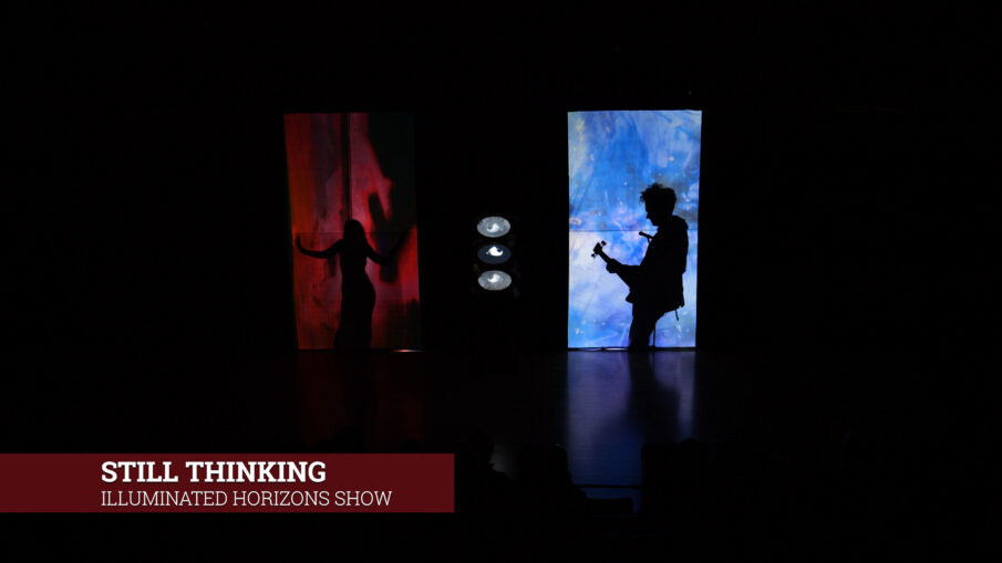 The opening act, Still Thinking — the duo of Lucie Blaze and Mitchell Vickery — set the tone with Shadowland, a work that felt simultaneously theatrical, cinematic and musical. Projected shadows of the performers moved across twin screens, merging with live guitar, poetry and a central sculptural installation of blinking eyes. The work occupied a cross media space: not quite a band, not quite theatre, but a haunting hybrid that asked us to reflect on the masks we wear and the selves we conceal.